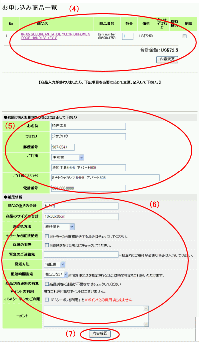 (5) 商品お届け先の確認。